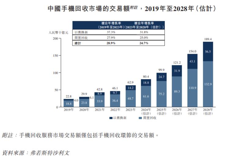 据弗若斯特沙利文的资料,以2023年自消费者端回收交易总额来算,闪回科技是我国最大的提供线下以旧换新的手机回收服务提供商,也是中国第三大手机回收服务商,市场份额分别约为7.4%及1.4%。