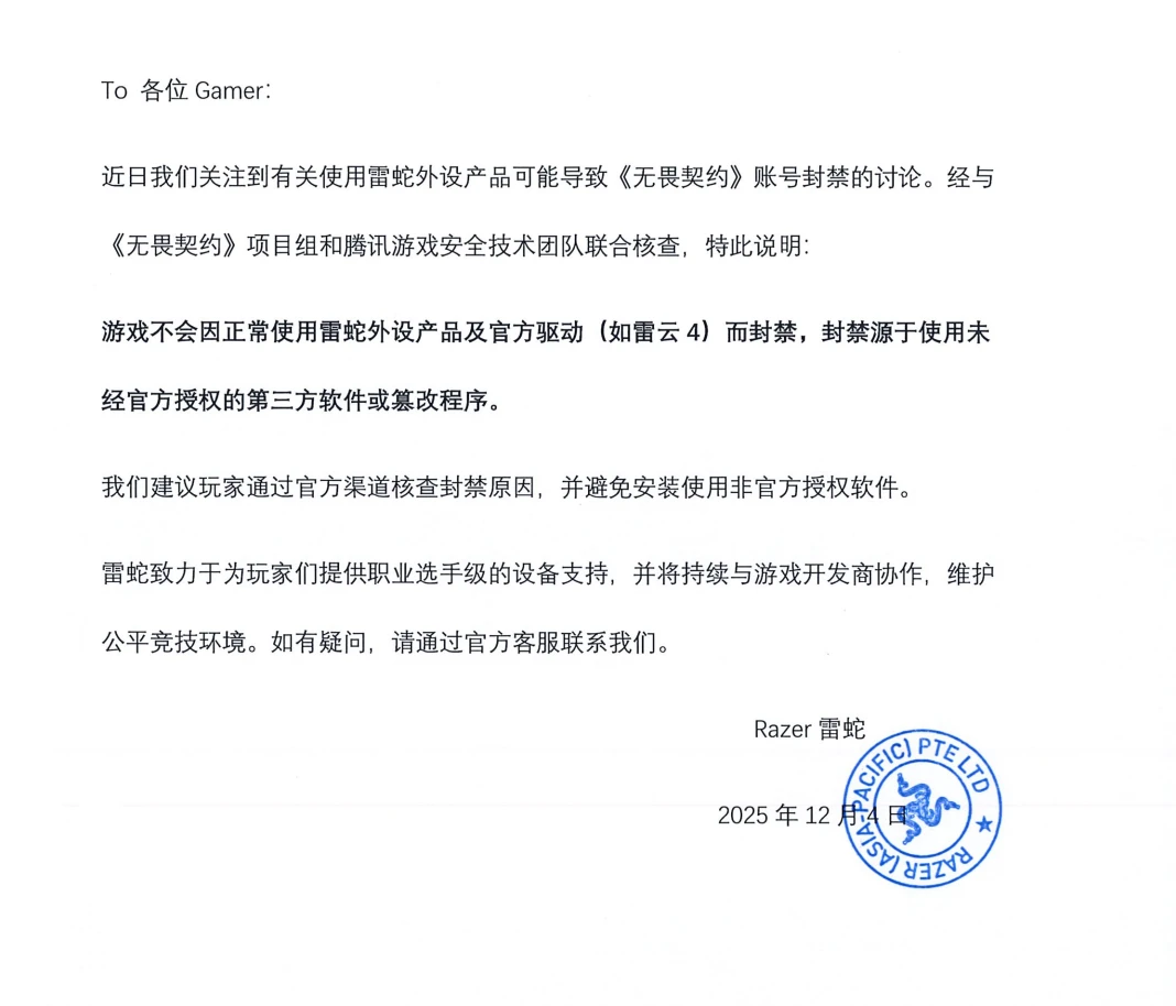 玩家遭遇的封禁源于使用未经官方授权的第三方软件或篡改程序,雷蛇建议玩家通过官方渠道核查封禁原因,并避免安装使用非官方授权软件。