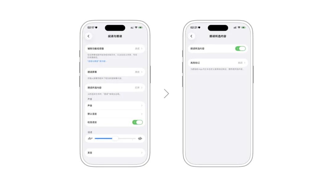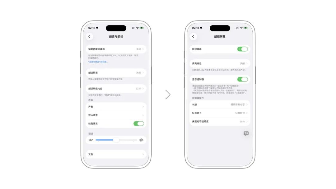 阅读与朗读是为视力障碍人士准备的功能,方便视障人士可以掌握屏幕中目前所显示的内容。当然,在一些适合语音朗读的场景(例如在地铁上看新闻或小说),其实也可以使用利用这一功能。