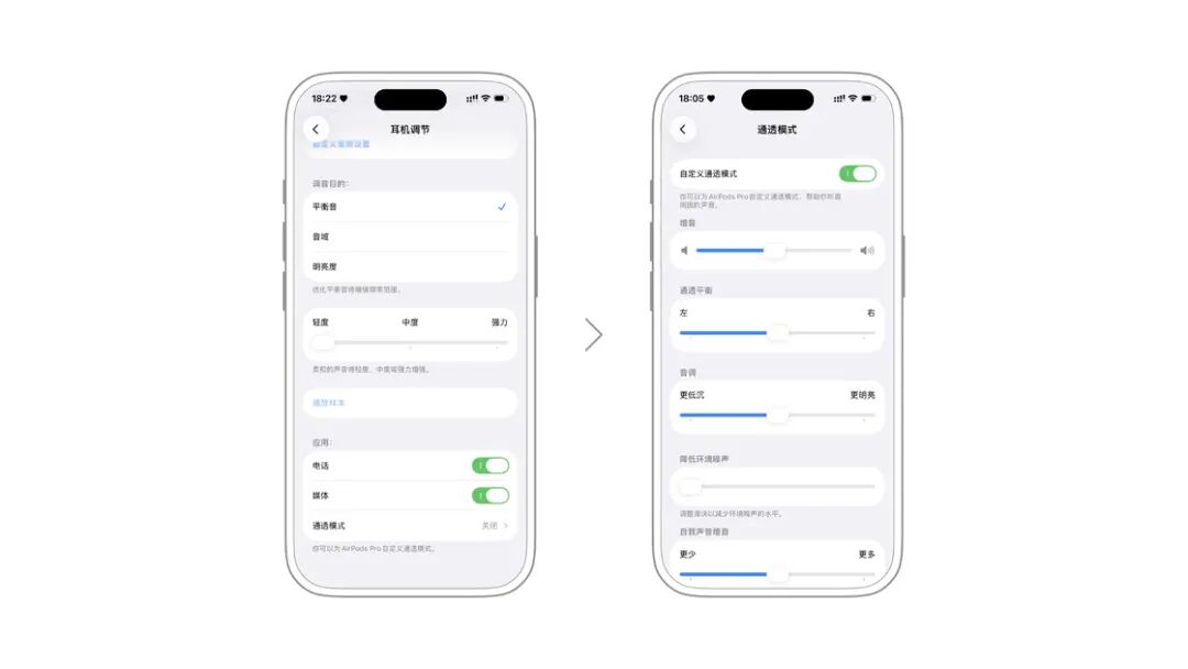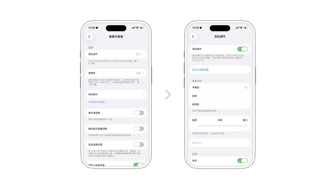 在设置 > 辅助功能 > 音频与视觉 > 耳机调节这里,可以对支持的 Apple 和 Beats 的耳机进行音频调节,包括「平衡音(增强频率范围)」「音域(增强中频)」「明亮度(增强高频)」三项,分别可调节至轻 / 中 / 强度三档。