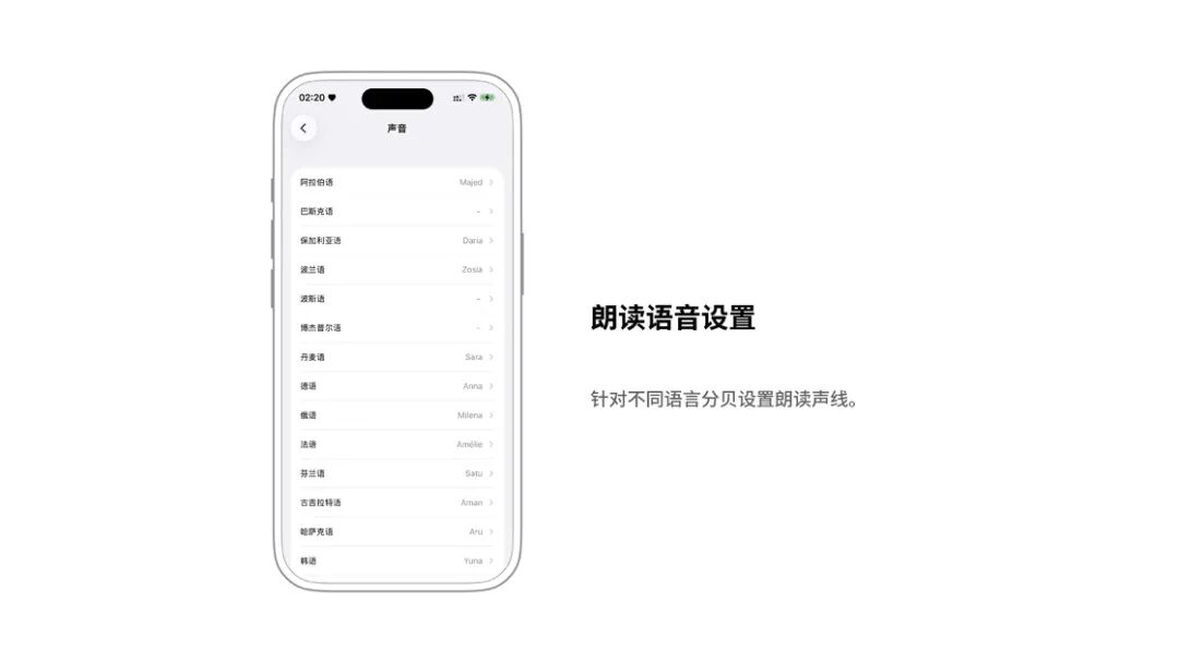 如果要更改以上「朗读内容」的声线,只需要在同一屏设置页的「声音」处更改即可,在这里你可以设置各支持语言的对应的不同声线。此外,语速和发音也可以自定义,甚至可以添加对特定词语的发音,当然要自行录入关键词和发音。