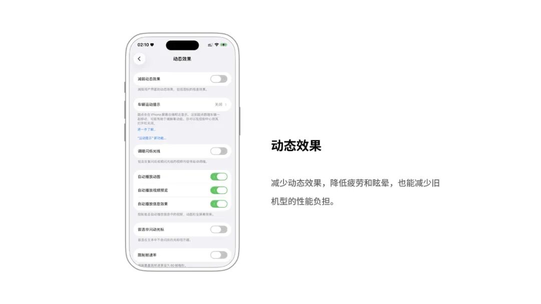 众所周知, iOS 的一大特点就是它无处不在的、丝滑的非线性动画。从设计角度,不可否认这些动画确实赏心悦目,但是对于一些特殊视力状况的用户而言,频繁的动画反而可能导致疲劳和眩晕等症状。此外,对于性能不足的旧款机型而言,太多的动画效果会加重性能负担,造成卡顿。