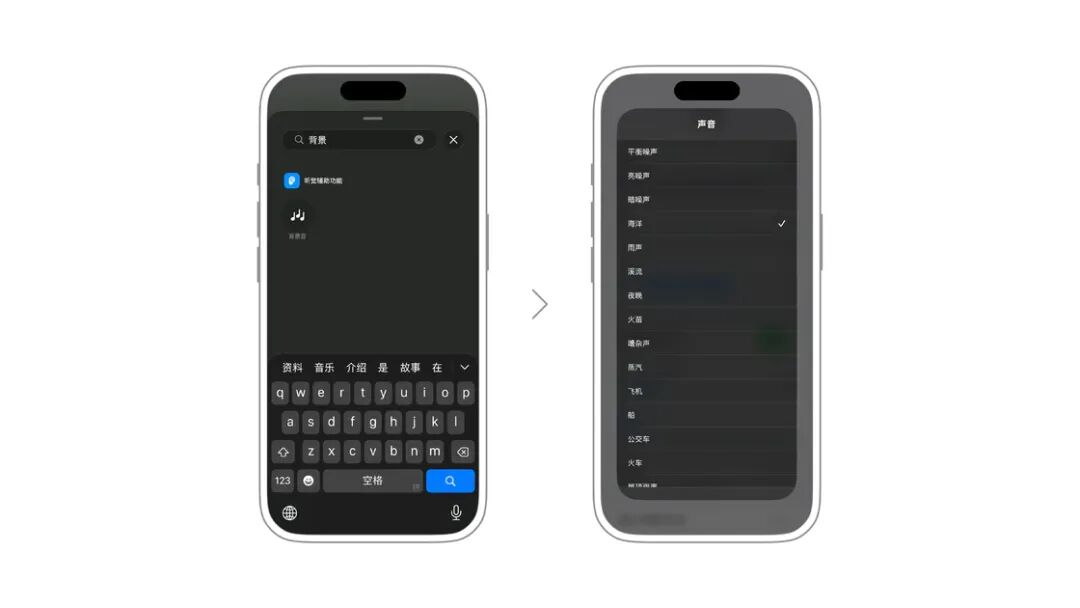 注意力不集中,需要点背景噪音?现在不再需要第三方 App ,只需要进入 设置 > 辅助功能 > 音频与视觉 > 背景音 打开开关,就能得到一段白噪音了。