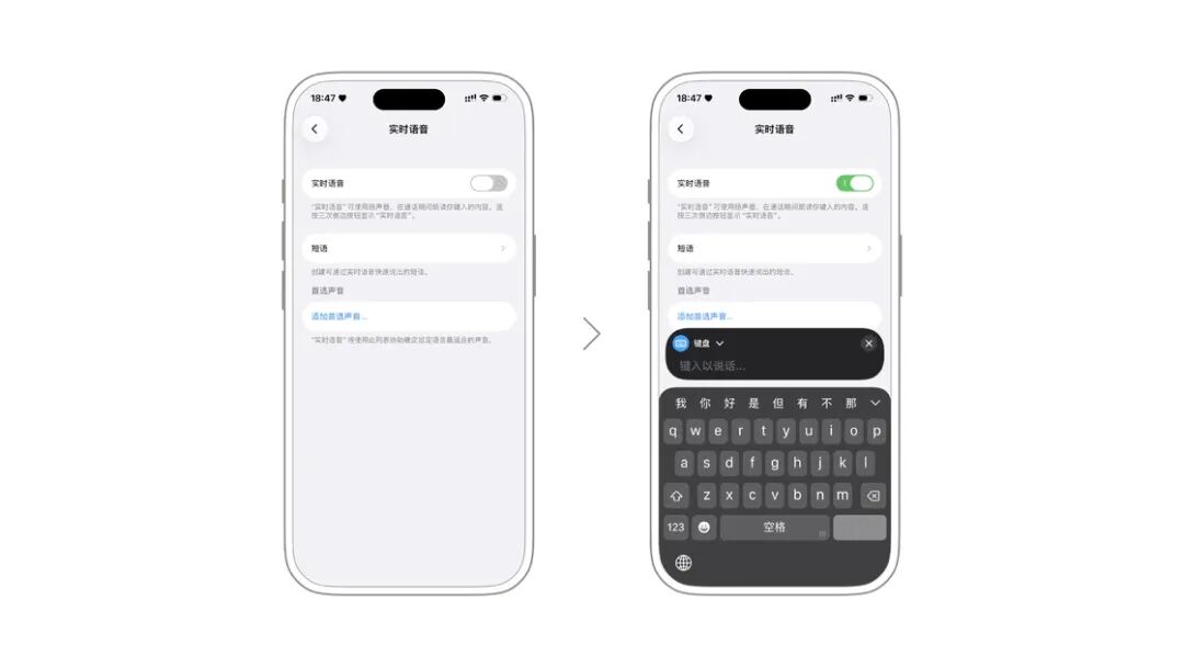 实时语音可以帮助无法说话的用户在需要的时候直接发声,在碰到问路、点菜等及时性较强的场景时,可以通过语音来便捷地达成目的。在辅助功能中打开实时语音,连续按三次侧边按钮即可显示「实时语音」窗口,通过键入内容,可以让系统的声音读出文字,系统声音可以切换成不同的人声音色。