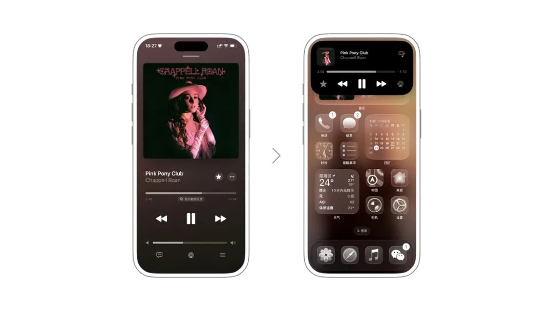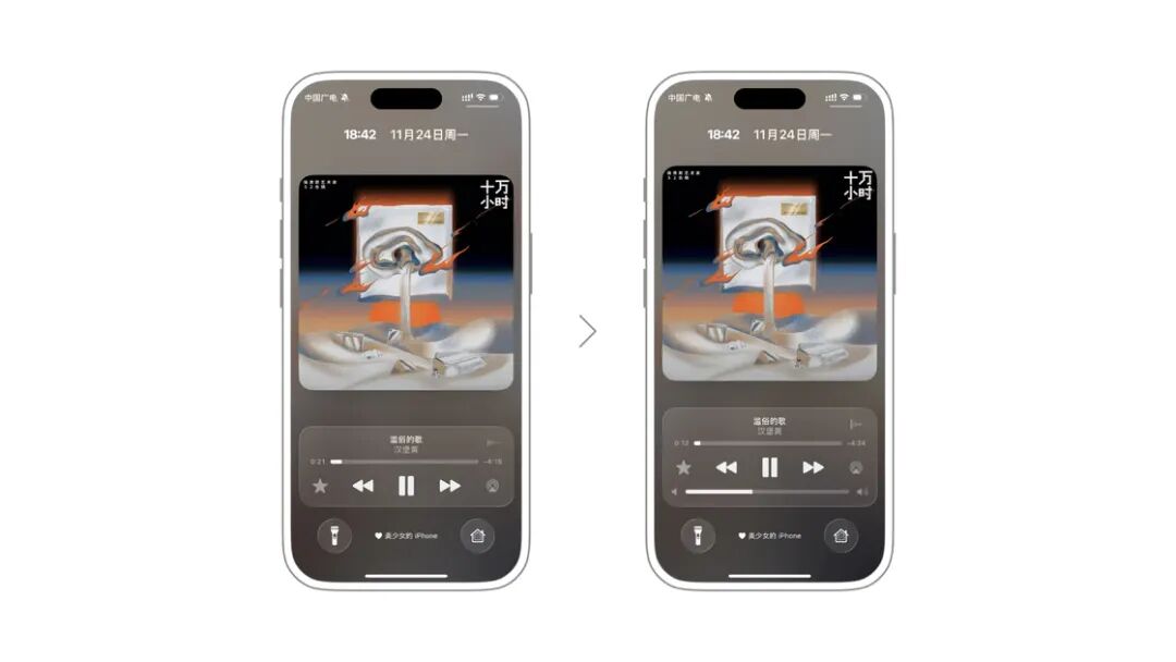 始终显示音量控制:在使用 iPhone 内置扬声器或连接耳机时,锁屏的正在播放实时活动卡片会一直显示音量条。
