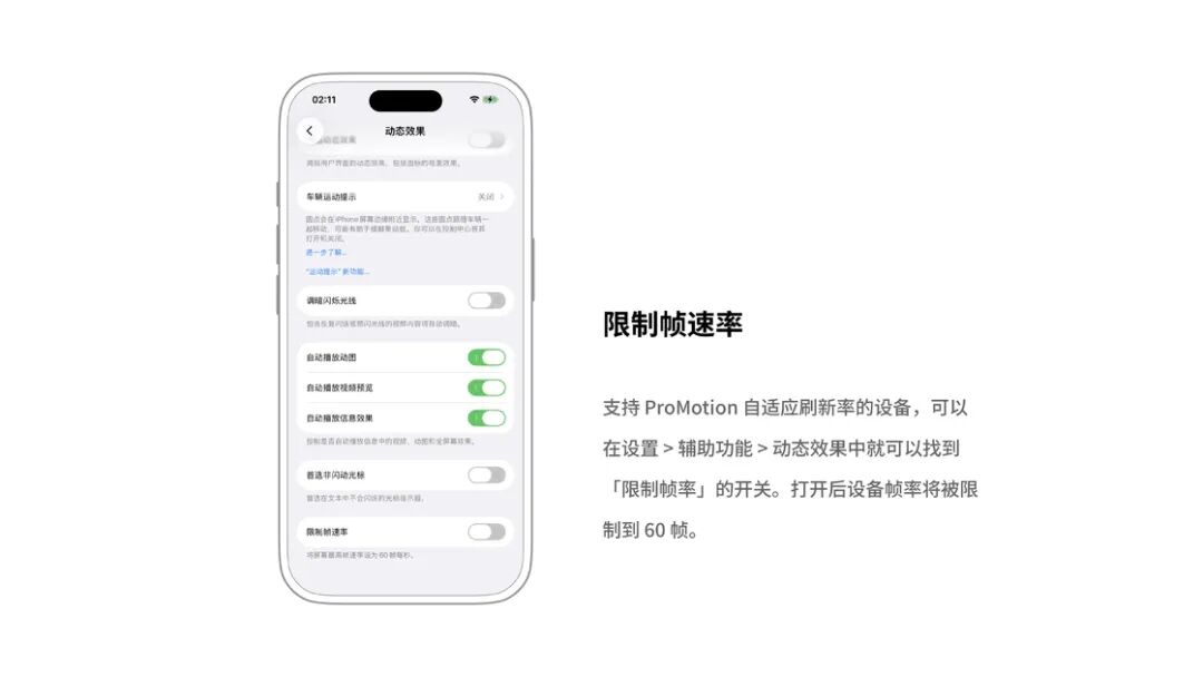 支持 ProMotion 自适应刷新率的设备,如 iPad Pro 和 iPhone 13 Pro 或更新的 iPhone Pro,以及 iPhone 17 与 iPhone Air,在设置 > 辅助功能 > 动态效果中就可以找到「限制帧率」的开关。打开后设备帧率将被限制到 60 帧。