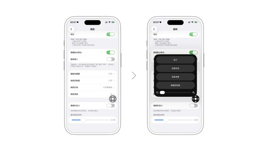「缩放」可以看作一个「全局放大镜」,可以在设置 > 辅助功能 > 缩放处打开。