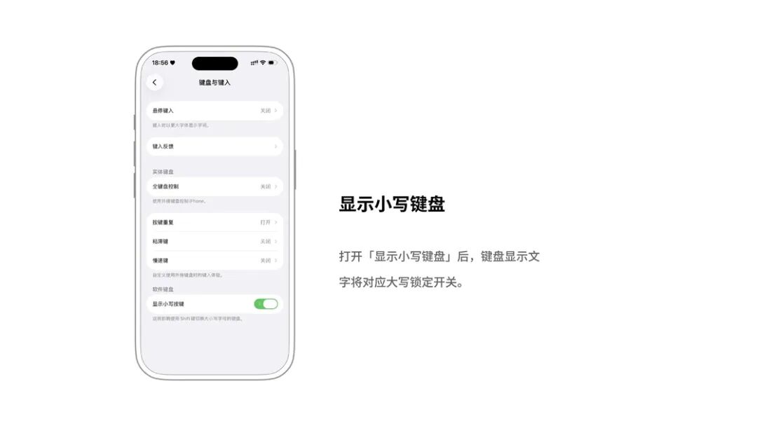 软件键盘:可以在这里把「设置>辅助功能>键盘>显示为小写按键」这个开关关掉,从而使手机上的键盘跟所有的外设保持一致的大写。