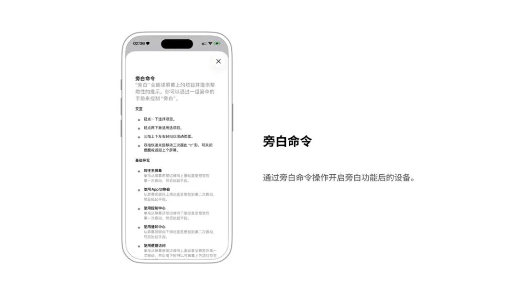 在「旁白」模式下,系统默认用户通过视觉获取资讯这一途径受限,无法直观地点击,此时基础的操作模式就从原本的单指滑动或轻点变成了多步操作: