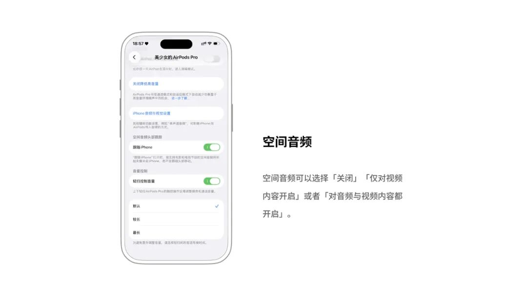 空间音频:空间音频的效果大多数时候很惊艳,但有时也会变成「负优化」,例如对没有针对性录制的音乐造成音量衰减。此时,可以在这里选择关闭 / 仅对视频内容开启/对音频与视频内容都开启,免去了听音乐时还要到控制中心中关闭「空间音频」的多余操作。