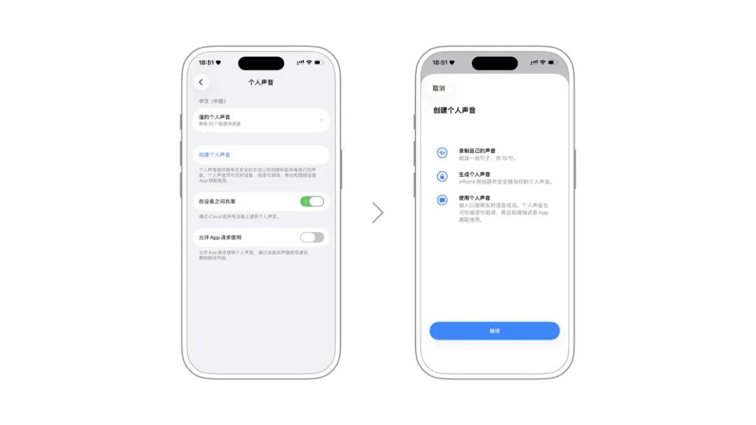 「人声快捷指令」可以创建特定声音执行的具体快捷操作。例如,可以设置 iPhone 每次听到某个语音时直接打开付款码。这项功能是为严重非典型语音人士提供通过特定语音来让 iPhone 执行操作而设计的。