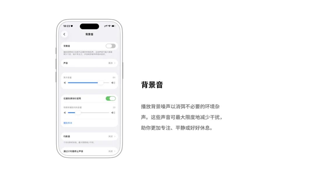 用官方的表述,这项功能可以「播放背景噪声以消弭不必要的环境杂声。这些声音可最大限度地减少干扰,助你更加专注、平静或好好休息。」