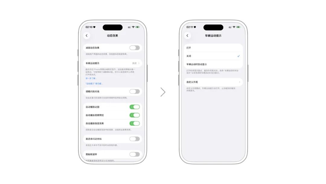 在 iOS 中,可以打开「显示车辆运动提示」选项。在选项打开时,iPhone 屏幕周围会显示圆点,这些圆点会随着车辆一起运动,有减轻晕动症的效果。如果你将选项设置为「自动」,则 iPhone 在检测到你在车辆中旅行时会自动显示这些圆点。