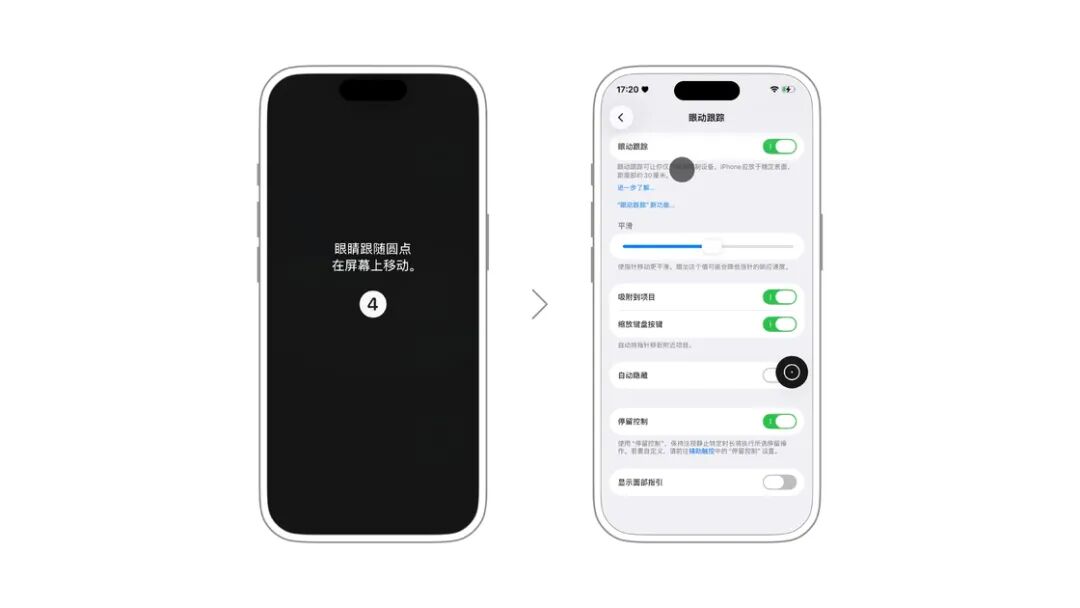 「眼动追踪」功能可以让你仅使用眼睛即可对设备进行控制。打开后,设备会开启一个页面帮助你进行眼动追踪校准。校准完成后,屏幕上将会出现一个光标,这个光标会跟随眼睛的移动而移动。默认情况下,注视某个项目一段时间就会激活这个项目。