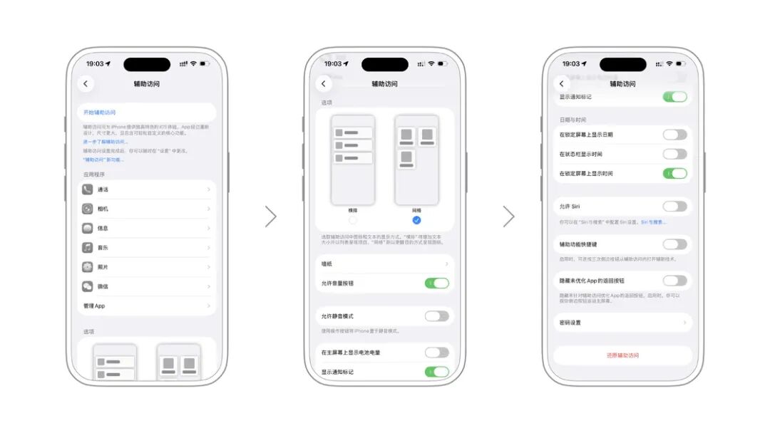 iOS 「隐藏」了一种尺寸更大、包含核心功能的辅助模式供用户选择。在该模式下,主界面被被精简为大图形的方块图标,用户可以方便地定义自己想放置的应用。与此同时,墙纸、音量、锁屏时间等内容均支持自定义。