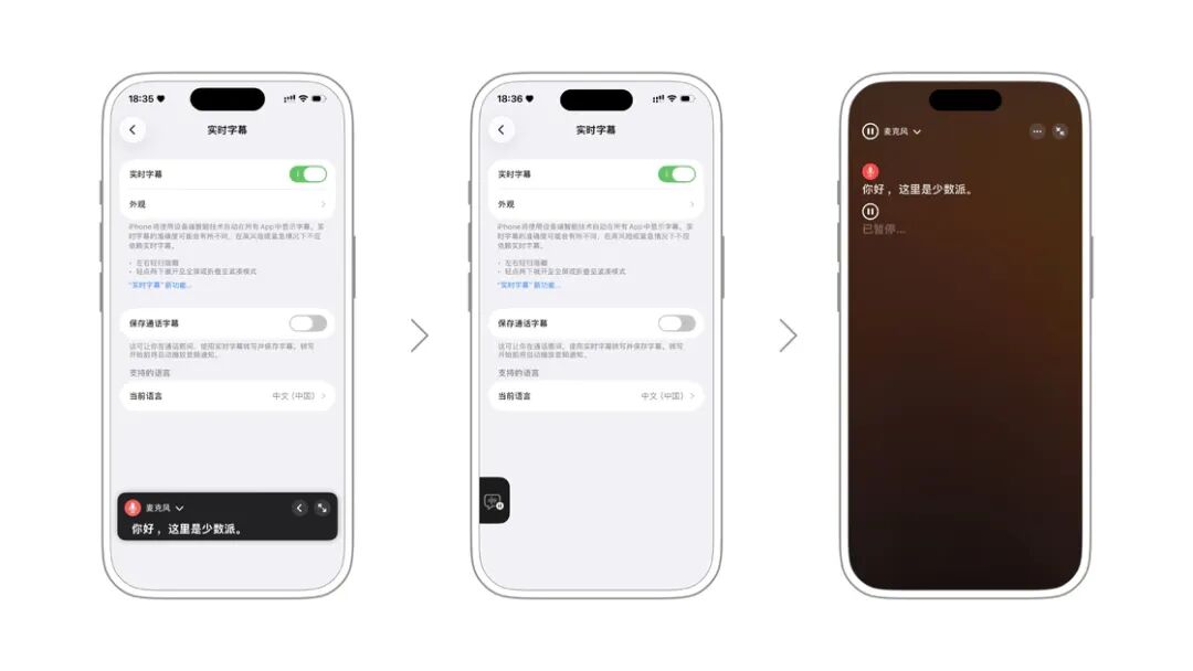 实时字幕可以在 iPhone 屏幕上显示一个实时的语音转文字的窗口,方便听障人士及时通过 iPhone 获取声音信息。