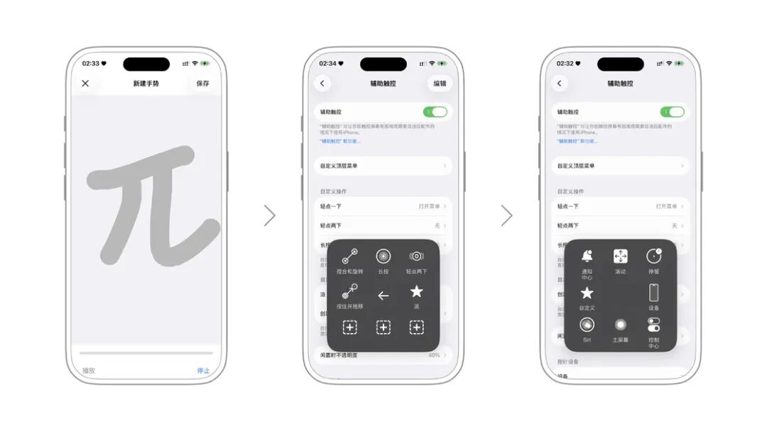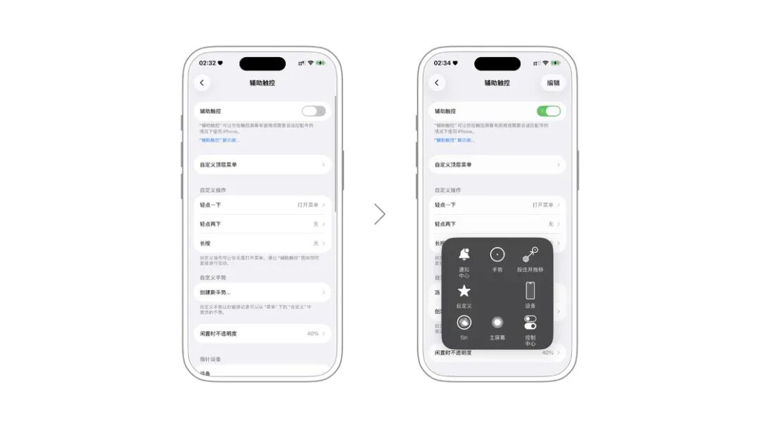 除此之外可以通过「自定操作」更改对「辅助触控」轻点、点两下、长按所对应的功能,通过这个设置可以摆脱「辅助触控」的经典菜单,从而实现比如点一下就回到主页面,点两下进入多任务界面,长按小白点锁屏等更快捷的操作。