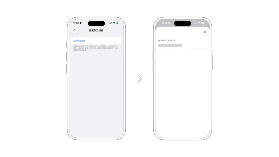 控制附近的设备:如果你有一台登陆了相同账户的设备,当进行远程的功能演示时,可以通过该功能进行远程控制。例如当 iPad 在此处时,可以通过 iPhone 进行控制,包括快速返回主屏、打开控制中心等快捷操作。