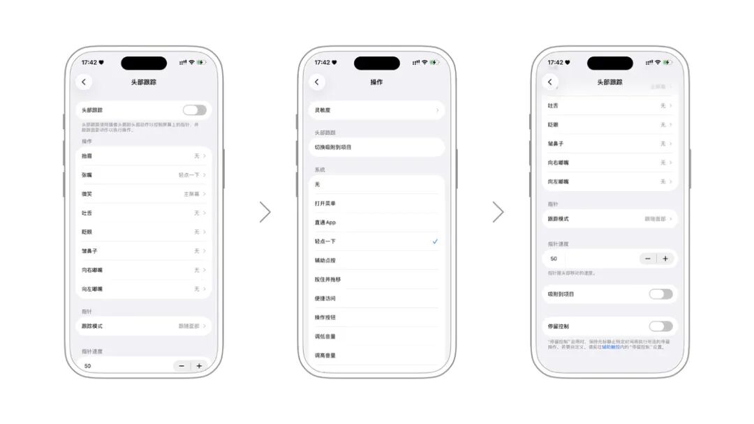 打开头部跟踪后,你可以选择对应的头部动作和面部表情执行的操作,例如张嘴、吐舌、眨眼等。其中,「吸附到项目」会自动将光标定位到附近的按钮、列表等可操作元素上,下方的「停留控制」在启用后,则可以在光标停留一段时间后,自动点击相应的元素。