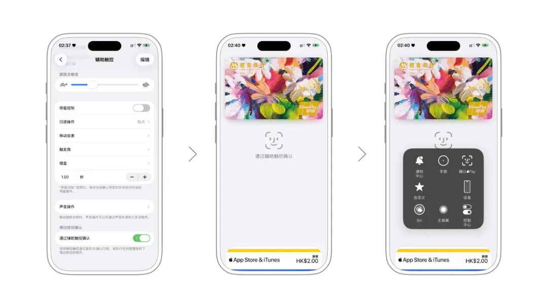此外,对于全面屏 iPhone,在「辅助触控」设置页的底端会有一个「通过辅助触控确认」的开关,开启之后,Apple Pay 支付、 App Store 购买 App 这些原本需要按两下侧边按钮启用 Face ID 验证的场景,会变成需要在辅助触控里启用验证。这项功能的本意是帮助那些不便对准 Face ID 验证操作的用户,但对于普通用户来说,也可以作为一种防止冲动消费、减少误操作的变通方法。
