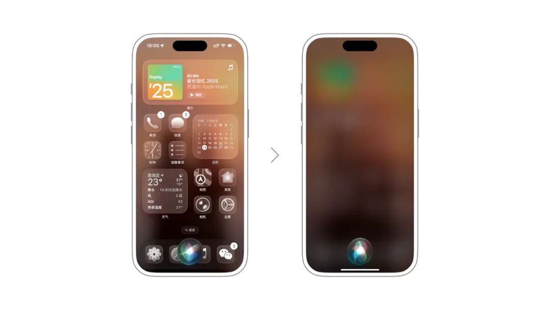 此外,「在 Siri 后面显示 App」的开关还可以调整 Siri 的显示效果。关闭时,Siri 就只会出现语音小球和弹窗,打开后,就会恢复成以前全屏幕显示的样式。