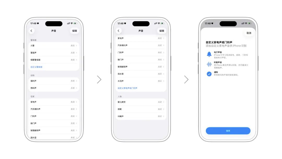 此外,你还可以点击自定义来让 iPhone 学习某些还没有内置的声音。设定好后,在 iPhone 识别出这类声音的时,就会推送通知。