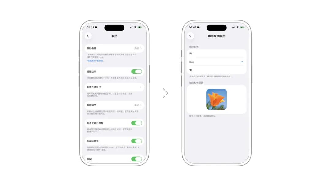 触感触控:iPhone 曾经短暂地支持过「3D 触控」功能,即屏幕支持检测按压的力度,并针对重按操作给出不同的反馈。但由于使用率很低,且在大尺寸屏幕上支持的难度较高,iPhone XS 之后已经取消了 3D 触控,转而采用一种无需硬件支持的替代品,即用「长按」取代「重按」,也就是所谓的「触感触控」。