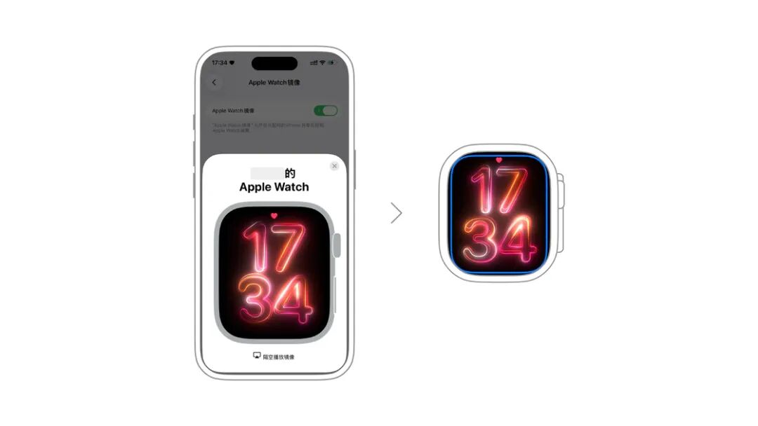 如果你需要操作 Apple Watch,但它放在其他地方充电,而 iPhone 在手边,那么就可以通过 Apple Watch 镜像来远程操控它。只要你的 Apple Watch 是 Series 6 及后续机型,进入 iPhone 的设置 > 辅助功能 > Apple Watch 镜像,就可以将它开启。开启后,iPhone 会自动连接附近的 Apple Watch,然后 Apple Watch 边缘会出现一圈蓝色光线,同时手机上实时同步显示手表界面。同时,iPhone 上显示的 Apple Watch 侧边的数码表冠也可以操作,点一下相当于按压一次。