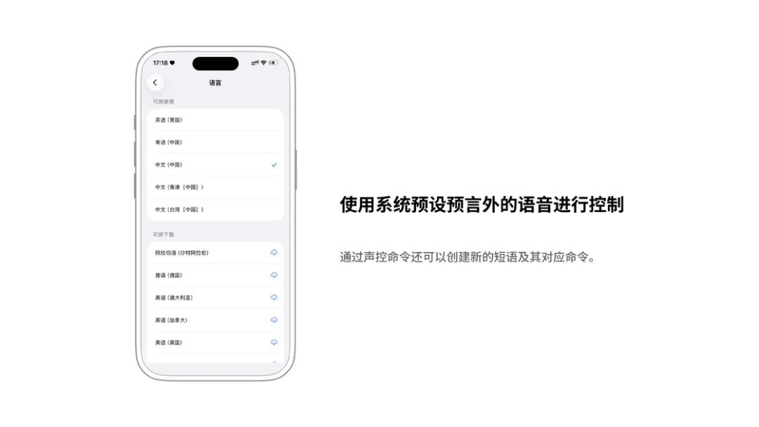 如果想使用系统预设语言外的语音进行控制,可以在设置页中「语言」内更改想要使用的语言种类;通过「自定命令」还可以创建新的声控短语和对应的操作,也可以在此开关一些系统预设的命令。