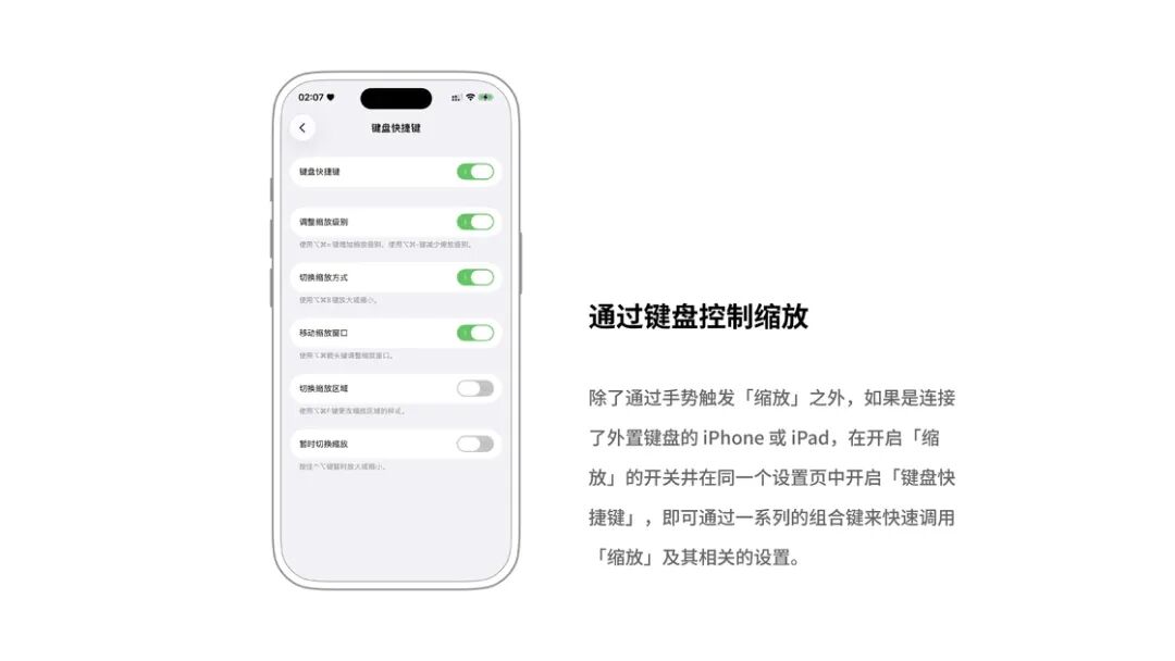 即使不连接外接键盘,也可以通过打开「缩放控制器」调出一个全局虚拟按钮(类似「辅助触控」的「小白点」),对它进行操作即可控制缩放(具体手势可在「缩放控制器」设置页自行调整):