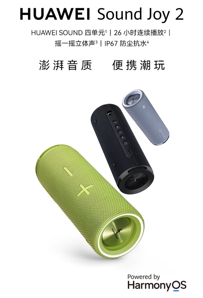 IT之家 9 月 25 日消息,华为 Sound Joy 2 系列音箱已在昨日的华为秋季全场景新品发布会上亮相。该系列音箱支持 IP67 防水,拥有 26 小时续航,首发 799 元起。