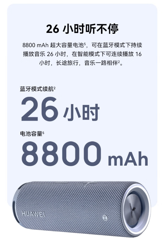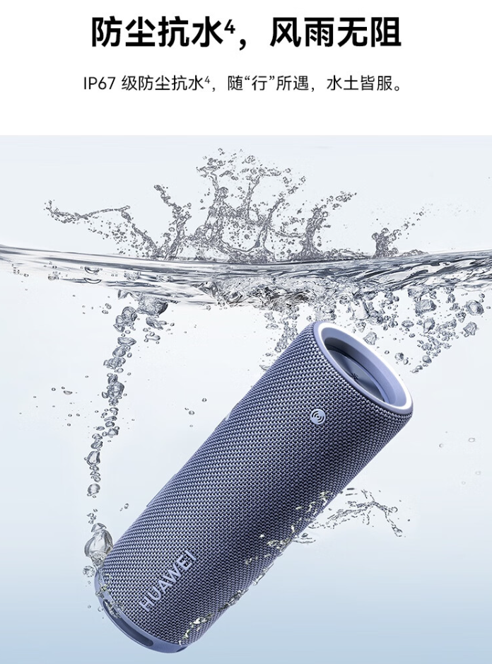 音箱内置 8800mAh 电池,支持 40W 快充、26 小时续航、蓝牙 5.2(AAC / SBC),充电 10 分钟可听歌 1 小时;内置 3 MIC 拾音 + NFC 模块,支持华为分享、一碰传音;音箱重 700g,还支持 IP67 防尘防水。
