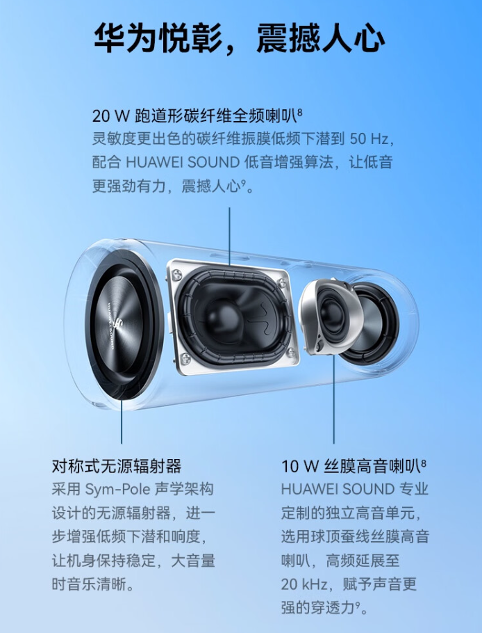 据介绍,华为 Sound Joy 2 音箱配备 4 单元 HUAWEI SOUND 系统,包含 1 个 20W 50mm×75mm 跑道型全频喇叭、1 个 10W 19mm 高音喇叭,2 个无源辐射器,采用超立体织物包布,高音扬声器采用丝质振膜,可提供 20kHz 高音。