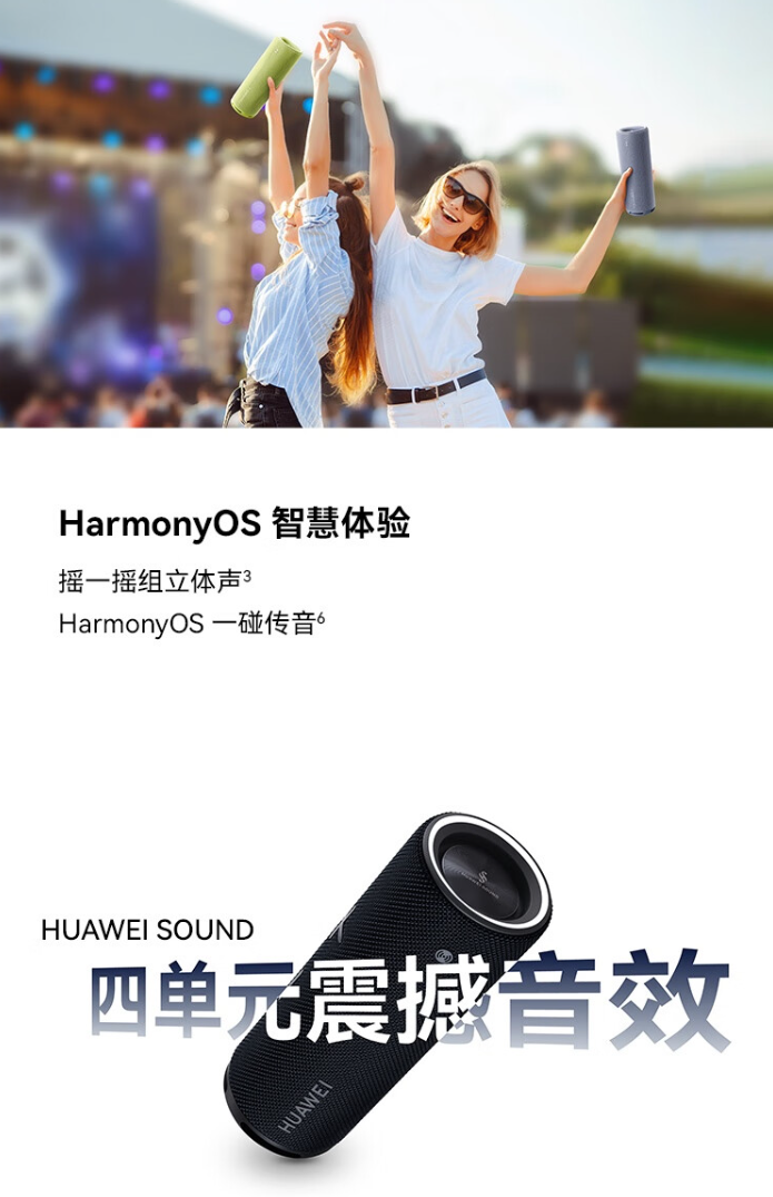 华为 Sound Joy 2 还支持摇一摇组合立体声,用户可以通过摇晃两台 Sound Joy 2 扬声器进行配对,创建立体声(最多 100 台串联),也可通过华为智能手表控制音乐播放、调节音量。