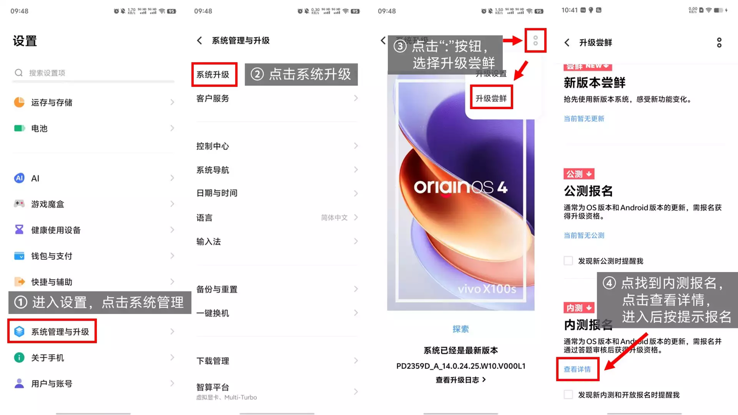 在手机桌面点击“设置 > 系统管理与升级 > 系统升级 > 右上角两点 > 升级尝鲜 > 内测报名卡片点击【查看详情】按钮,进入内测报名界面按照提示完成报名申请”;当内测报名下方按钮显示“您已加入本次内测,有版本时会推送给您”字样即为申请成功。