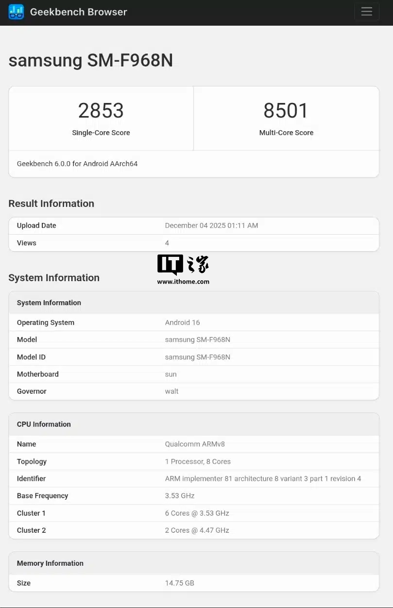 IT之家 12 月 5 日消息,科技媒体 SammyGuru 昨日(12 月 4 日)发布博文,报道称三星最贵手机、三星首款三折叠屏手机 Galaxy Z TriFold 的 GeekBench 跑分曝光,6.0.0 版本单核成绩为 2853 分,多核成绩为 8501 分,分别低于官方基准 9.6% 和 12.6%。