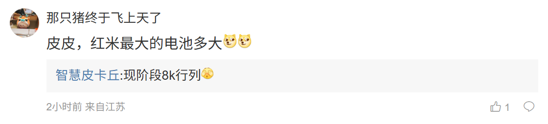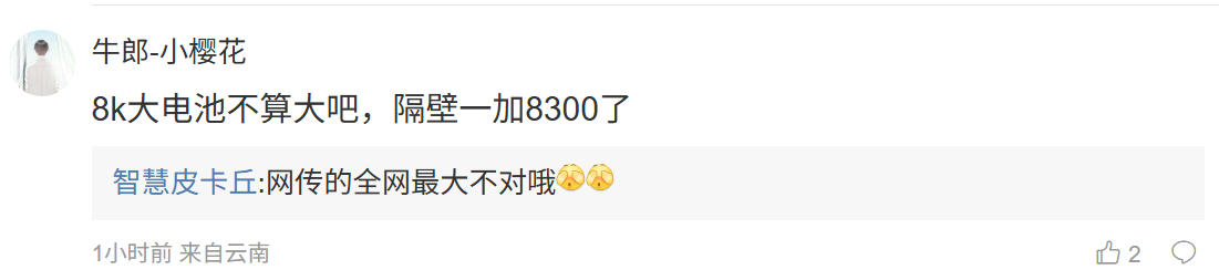 后续有用户在评论区询问:“皮皮,红米最大的电池多大”,博主回复道:“现阶段 8k 行列”;另一名用户则询问道:“8k 大电池不算大吧,隔壁一加 8300 了”,博主则回复道:“网传的全网最大不对哦”。