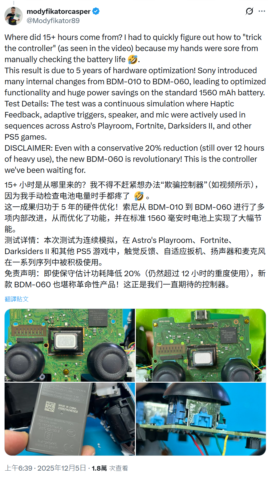 随后这名玩家拆解了新版 DualSense 手柄,发现这款手柄内部使用了 BDM-060 主板,这款主板的能耗更低,在实测中续航超过 15 小时。