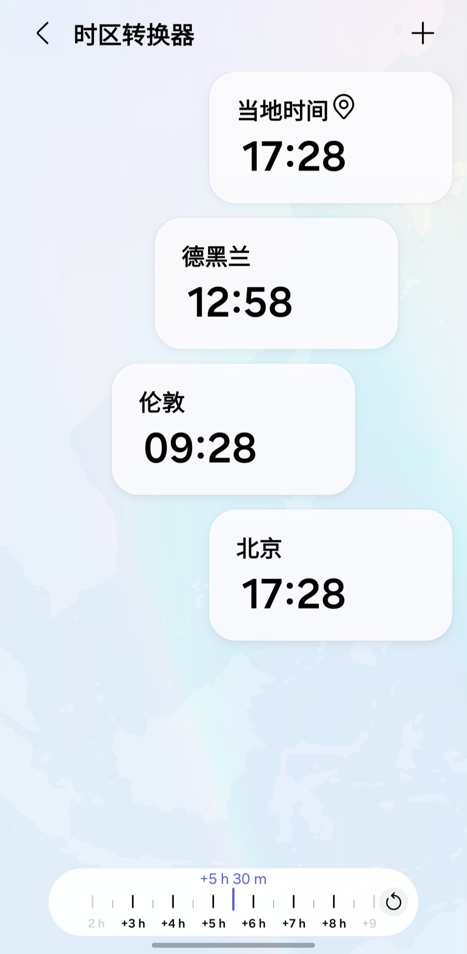 来到详细功能,现在闹钟标签页不再使用独立边框卡片呈现,转为使用大号渐变式圆角矩形,显得更加干净,中间还新增了所在时区的日出 / 日落时间,可根据用户所在地区、节气自动改变,让用户根据日出日落时间设定闹钟。