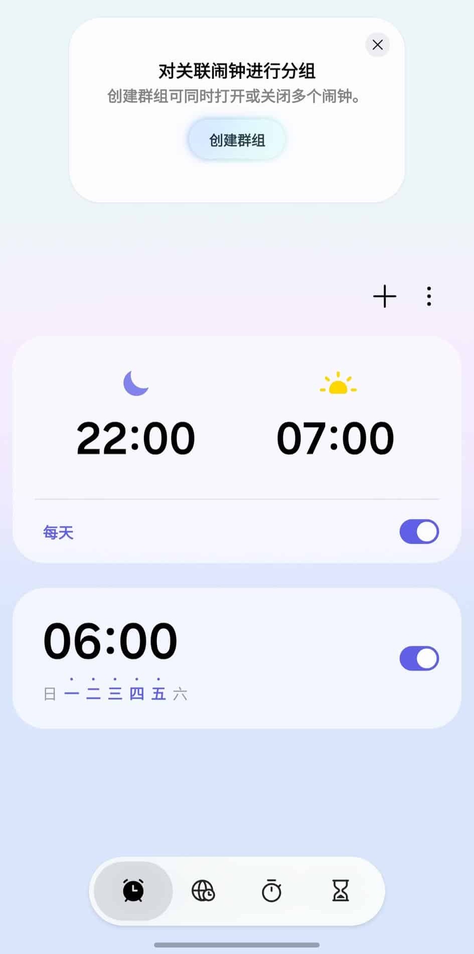 IT之家在此援引 SammyGuru,One UI 8.5 的闹钟一改往日的导航栏设计,转为使用了“大势所趋”的底部悬浮胶囊状菜单栏,同时菜单内只显示图标不显示文字标签,整体显得更加简洁,不过用户初次上手时可能会比较困惑,需要多用几次才能彻底记住每个图标代表的功能。