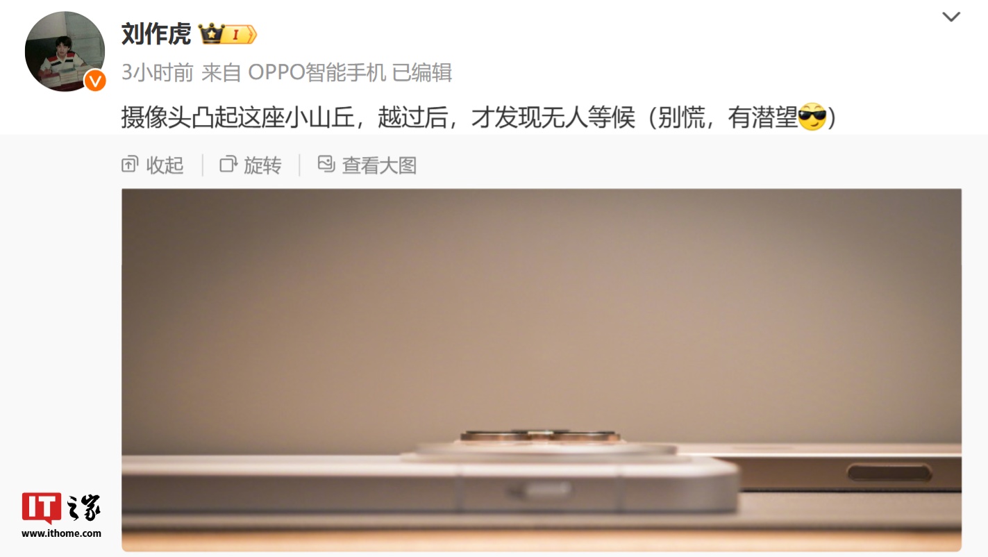 IT之家 9 月 25 日消息,OPPO 首席产品官、一加创始人刘作虎今日在微博分享了一张手机摄像头凸起对比图,并直言“别慌,有潜望”,暗示新机将搭载潜望镜头。