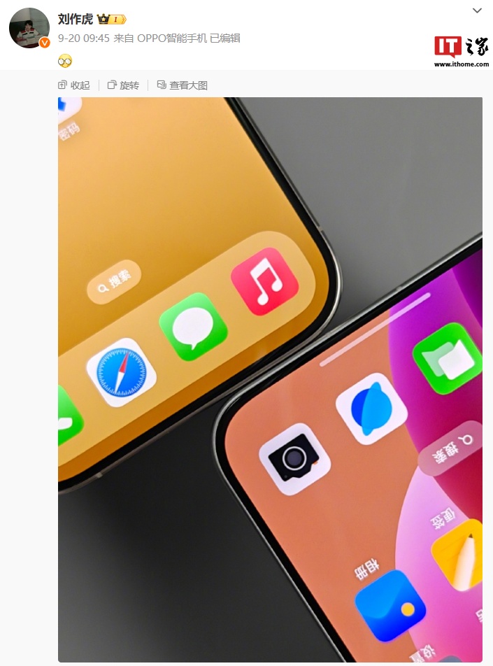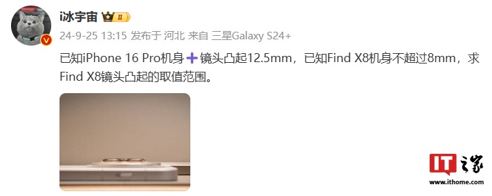图中共摆放两台手机,刘作虎并未公开具体机型。博主 @i冰宇宙 转发该照片,并提问通过 iPhone 16 Pro 机身 + 镜头凸起,求 OPPO Find X8 镜头凸起取值范围。此问暗指对比机型为 OPPO Find X8 和 iPhone 16 Pro 机型。