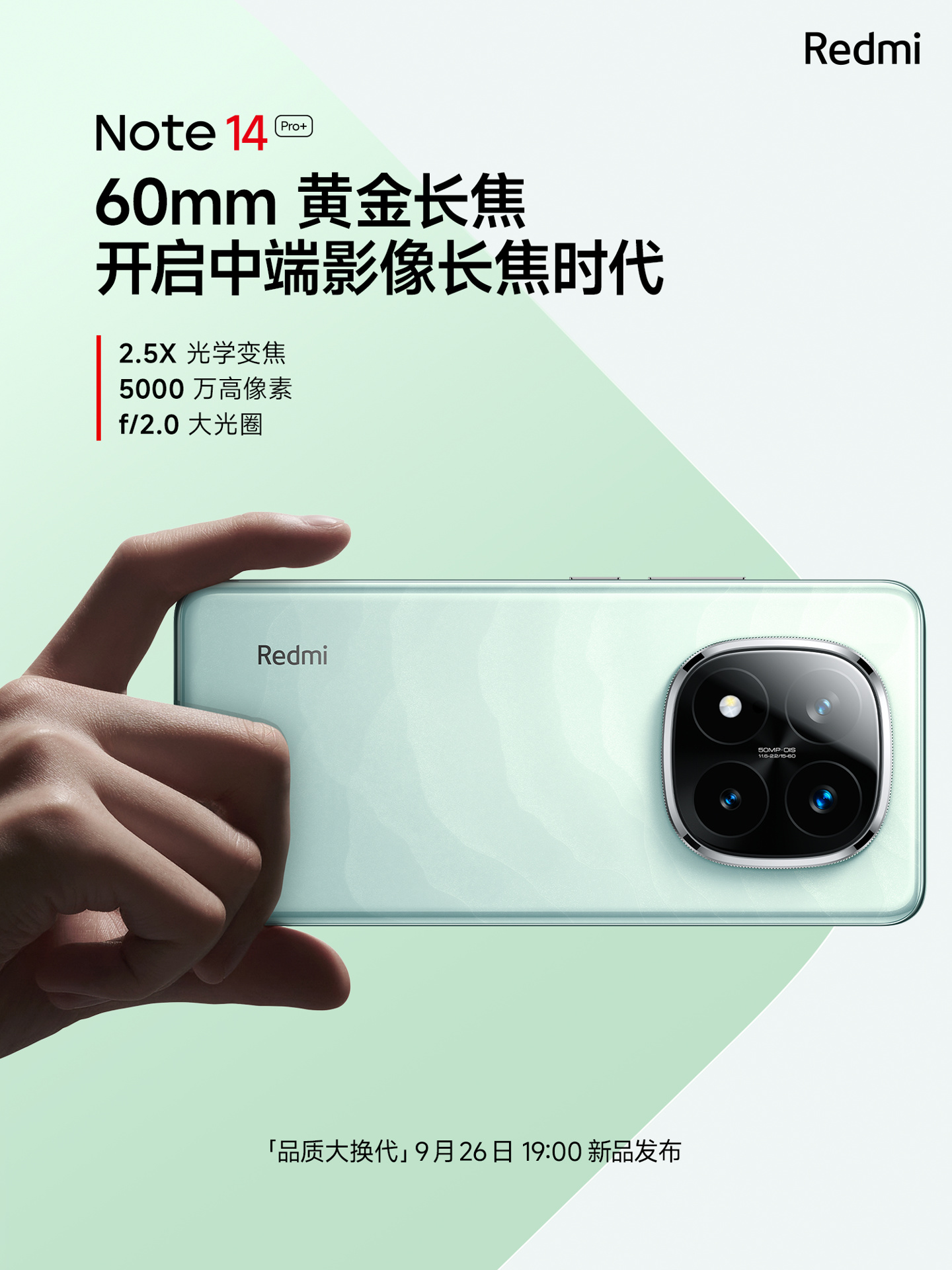 小米 Redmi Note 14 Pro+ 手机在影像方面将搭载“光影猎人 800”主摄,支持 OIS 光学防抖;配备“60mm 长焦镜头”,支持 2.5X 光学变焦。