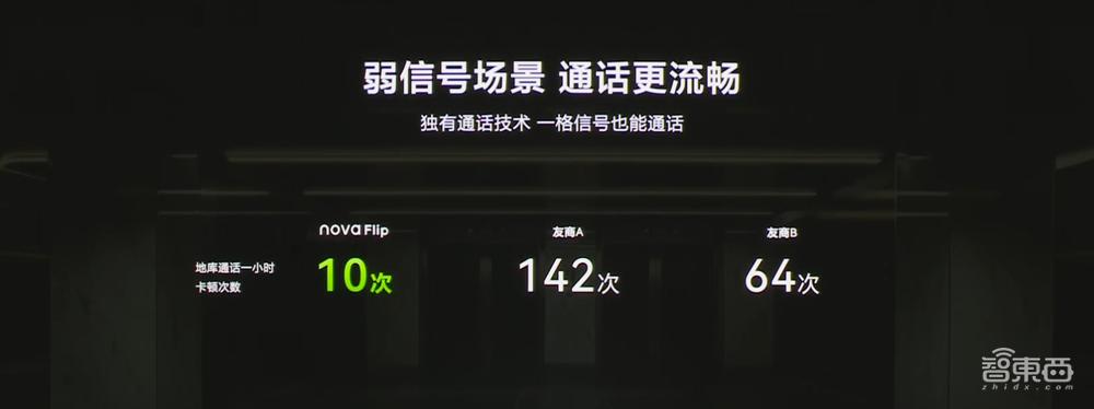 nova Flip折叠屏手机在地库通话1小时的卡顿次数,不到友商A的1/10