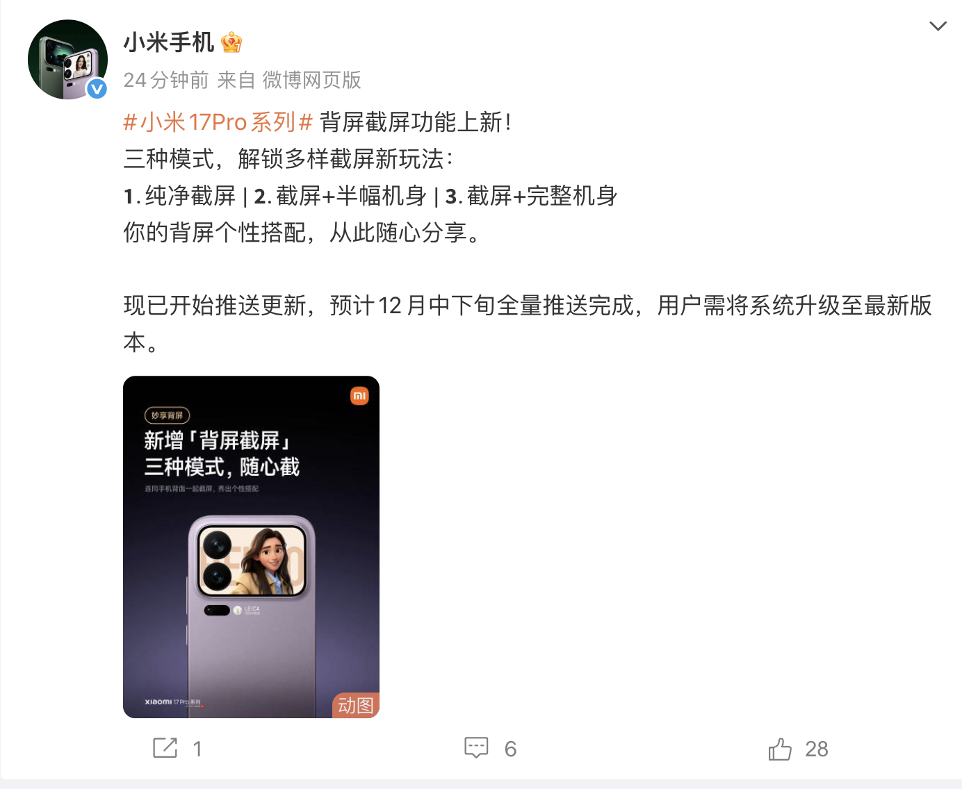 凤凰网科技讯 12月8日,小米手机官方宣布,小米17Pro系列背屏截屏功能上新,包含纯净截屏、截屏+半幅机身、截屏+完整机身三种模式。现已开始推送更新,预计12月中下旬全量推送完成,用户需将系统升级至最新版本。