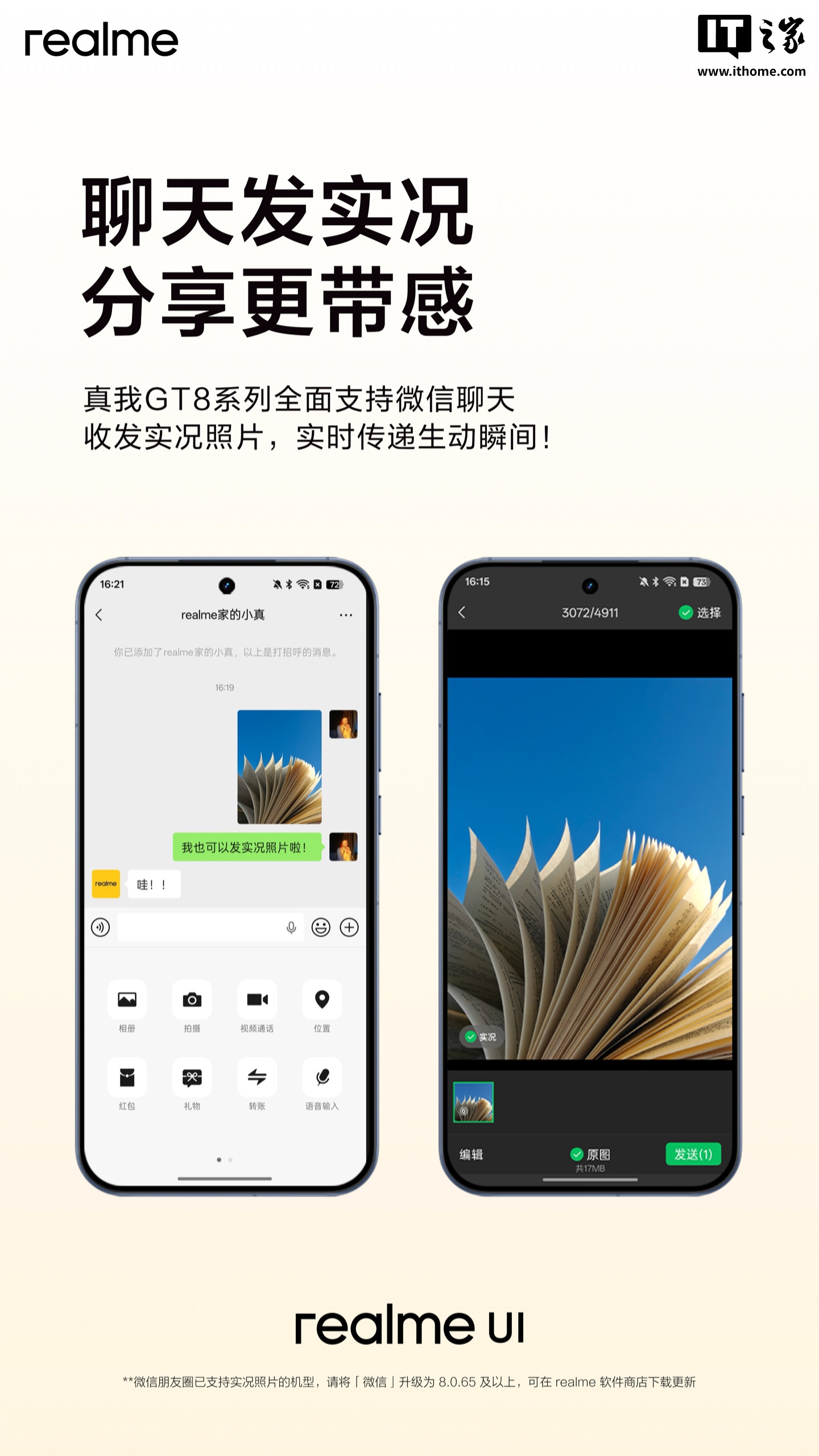 IT之家 12 月 8 日消息,真我 realme 副总裁、全球营销总裁、中国区总裁徐起今日宣布,真我 GT8 系列手机官宣全面支持微信聊天发送实况照片,更新至最新版的微信就可以使用。