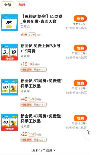 在美团上,不少网吧都上线了《黑神话:悟空》相关的套餐。比如固定时长的《黑神话:悟空》畅玩包或者账号免费试玩体验等。