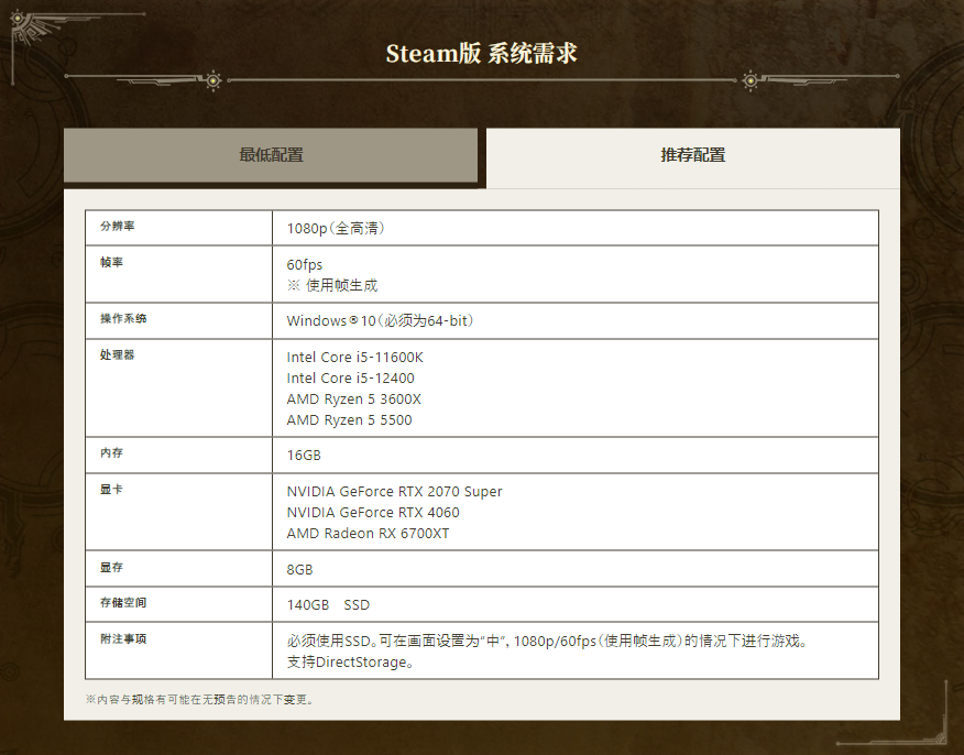 IT之家注意到,目前该作的 PC 配置已公布,最低配置(1080p 超清画质 30 帧)显卡需求 GTX 1660 Super 或 RX 5600 XT,推荐配置(1080p 全高清画质 60 帧)显卡需求 RTX 2070 Super 、RTX 4060 或 RX 6700XT,内容与规格有可能在无预告的情况下变更。