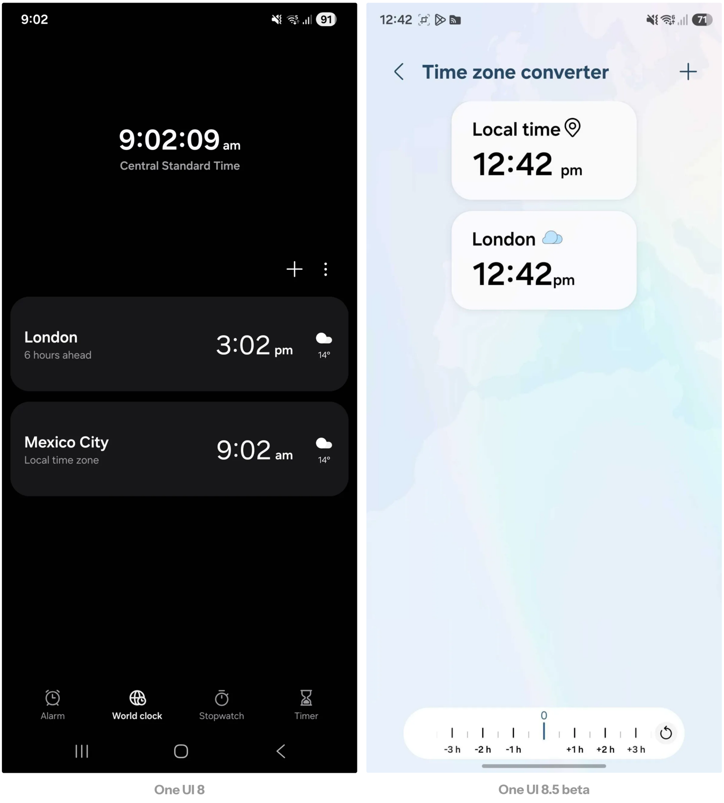 新版还改进了世界时钟功能。三星在界面底部新增了一个“时区转换滑块(Time-zone converter slider)”。