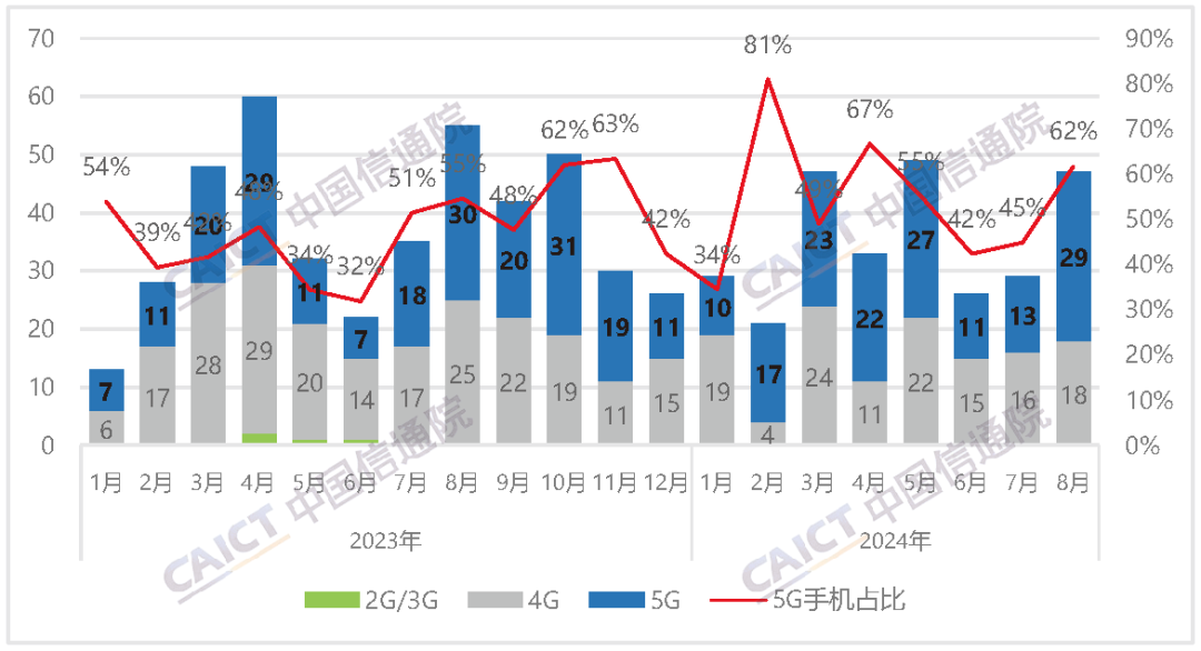 2024 年 8 月,国内手机上市新机型 47 款,同比下降 14.5%,其中 5G 手机 29 款,同比下降 3.3%,占同期手机上市新机型数量的 61.7%。